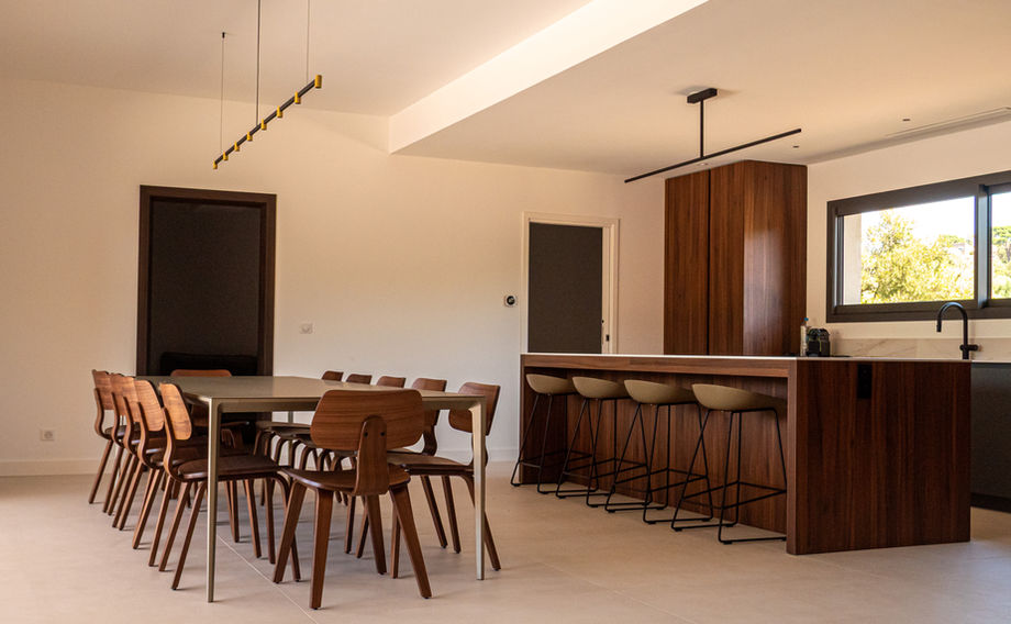 La villa se compose d'un Séjour lumineux avec cuisine entièrement équipée, espace repas intérieur s'ouvrant sur une terrasse en partie couverte de plus de 130 m²avec espace repas également