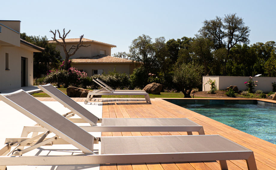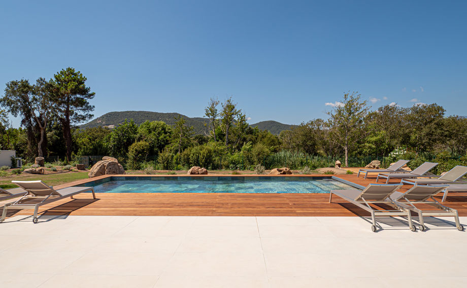 Terrasse aménagée avec espace repas, espace transats, piscine chauffée, boulodrome